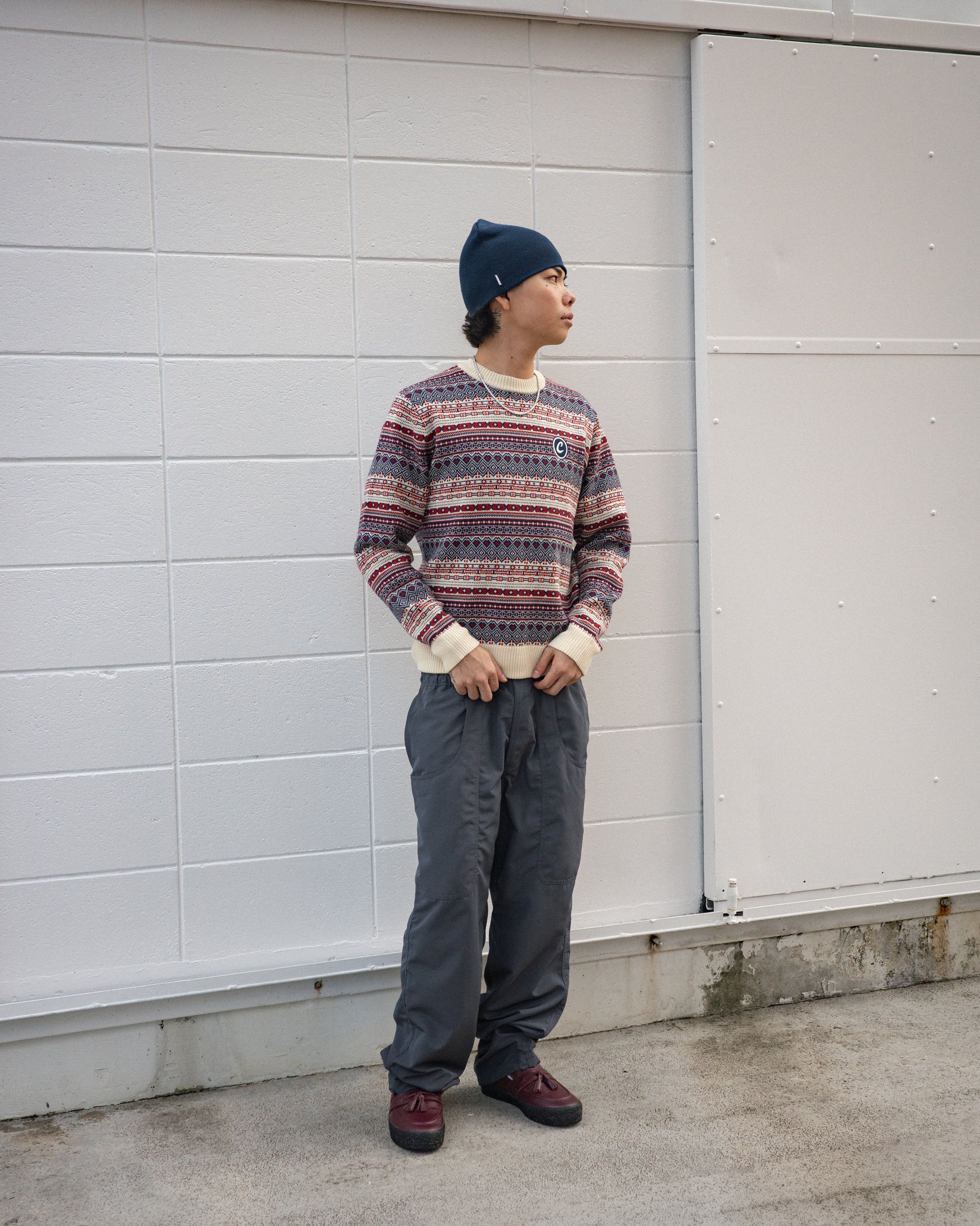 リブ部分はあえて単色でまとめ、総柄ながらもすっきりとした印象に。普段のコーディネートに取り入れやすく、幅広いスタイルにマッチします。
