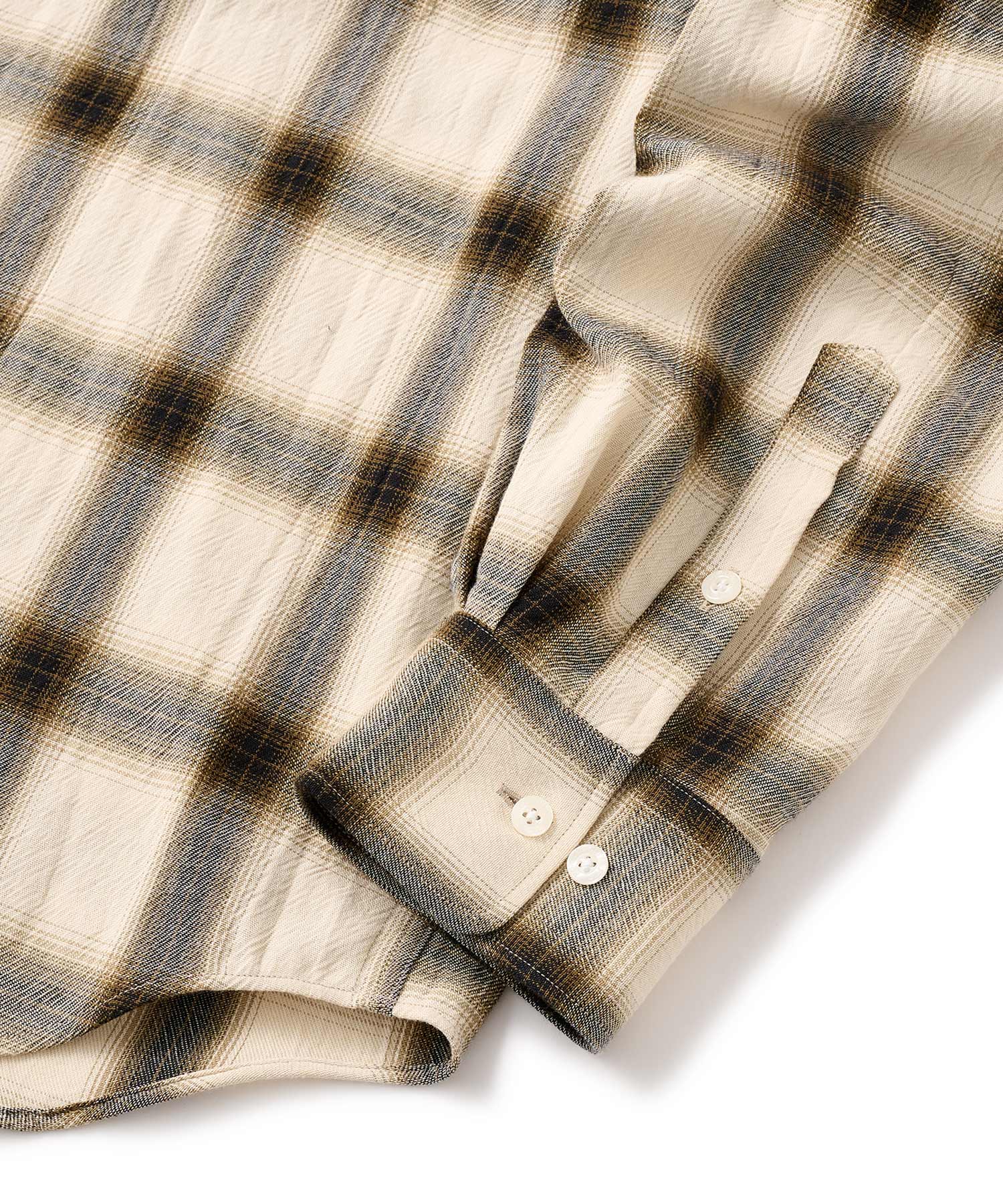 【ディテール】・ウォッシュド加工が施されたオンブレーチェックを使用したシャツ・バックヨークにハンガーループ・オリジナルボタン・左胸ポケットにピスネーム
