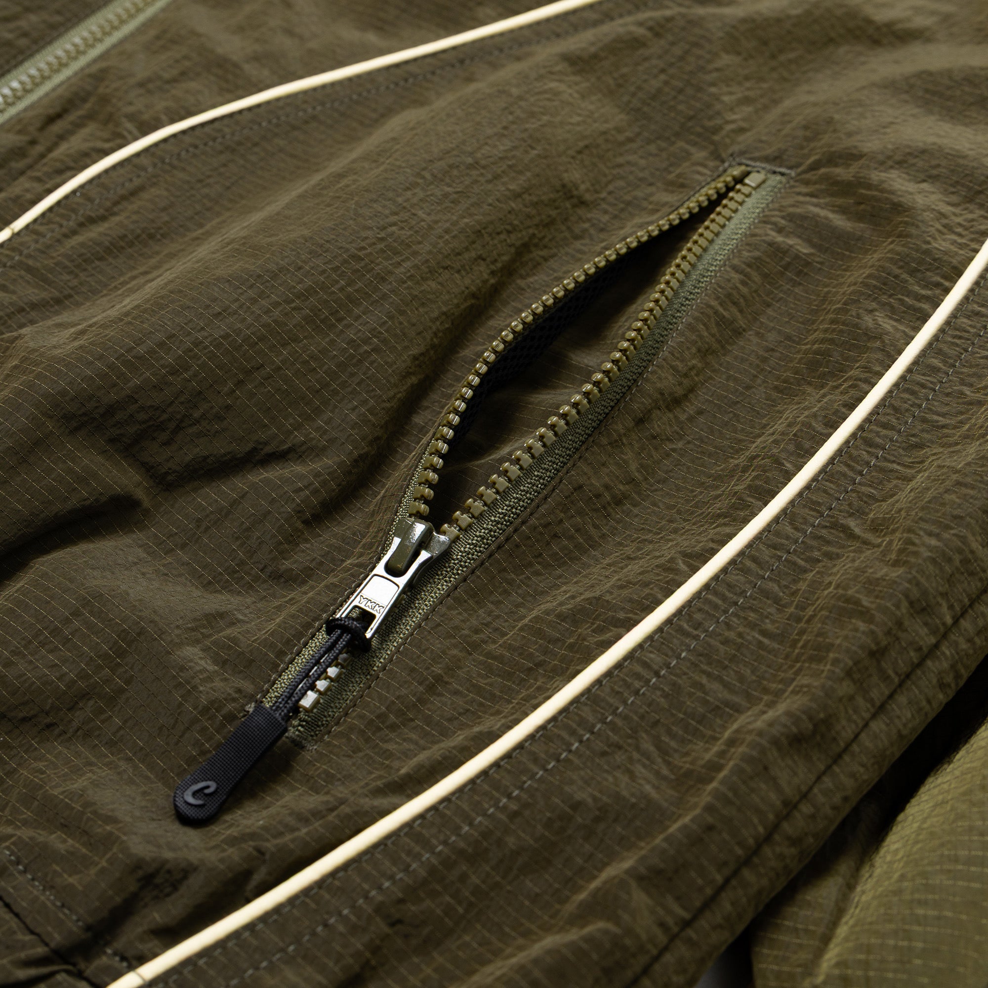 光沢感のあるシャリっとした質感のナイロンリップストップ生地を使用しており、軽快でスポーティな印象に仕上がっています。